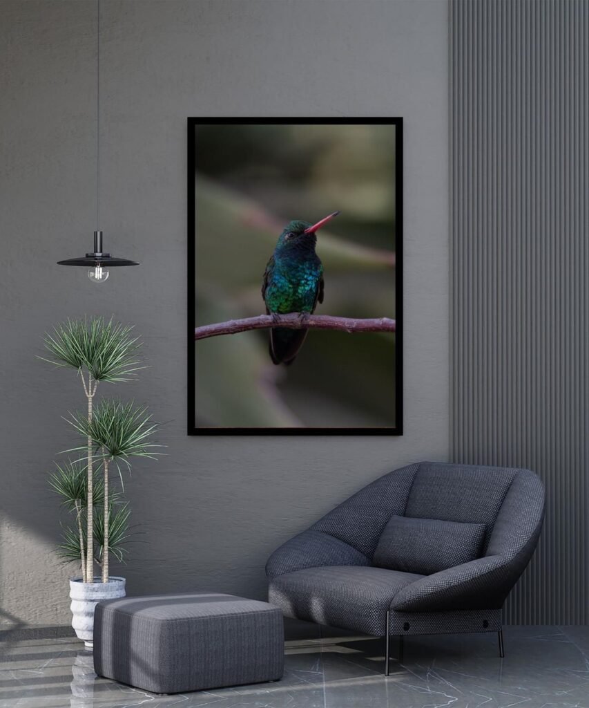 Transforma tus espacios con esta pieza artística que captura la belleza y el colorido de un colibrí en pleno descanso. Este cuadro decorativo está impreso en alta resolución y montado en un marco negro elegante, perfecto para ambientes contemporáneos.